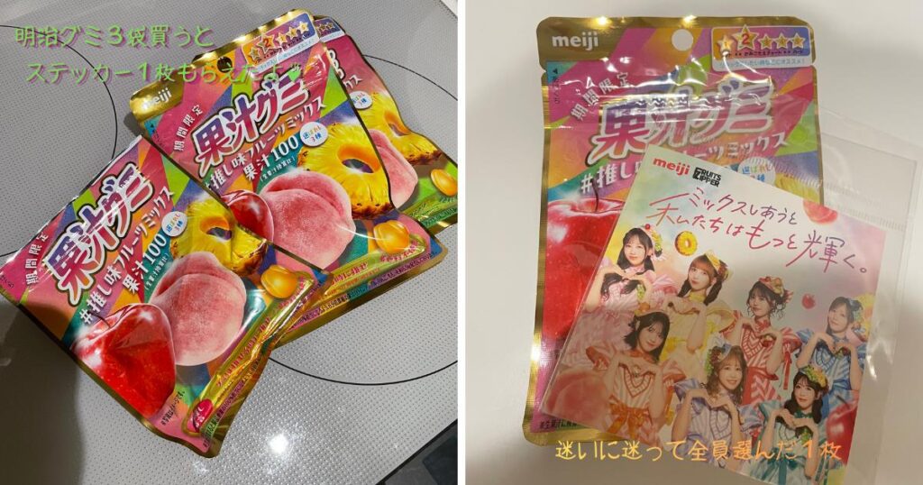 仕事終わりに明治のグミ3袋を買い、オリジナルステッカーを1枚もらいました。